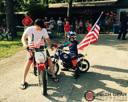 Check out some photos from this weekend when we drove our Hybrid Shop wrapped Prius in the Fourth of July Parade in Copper Canyon, TX. Our Service Manager, Ricky, and his young son rode their mini dirt bikes in the parade as well! Family fun abounds, and Rick got into the spirit of things, going for a spin on his grandson’s tiny dirt bike. It’s a far cry from the bikes he used to race in his pro motocross days, but hey, a bike’s a bike!
